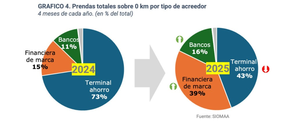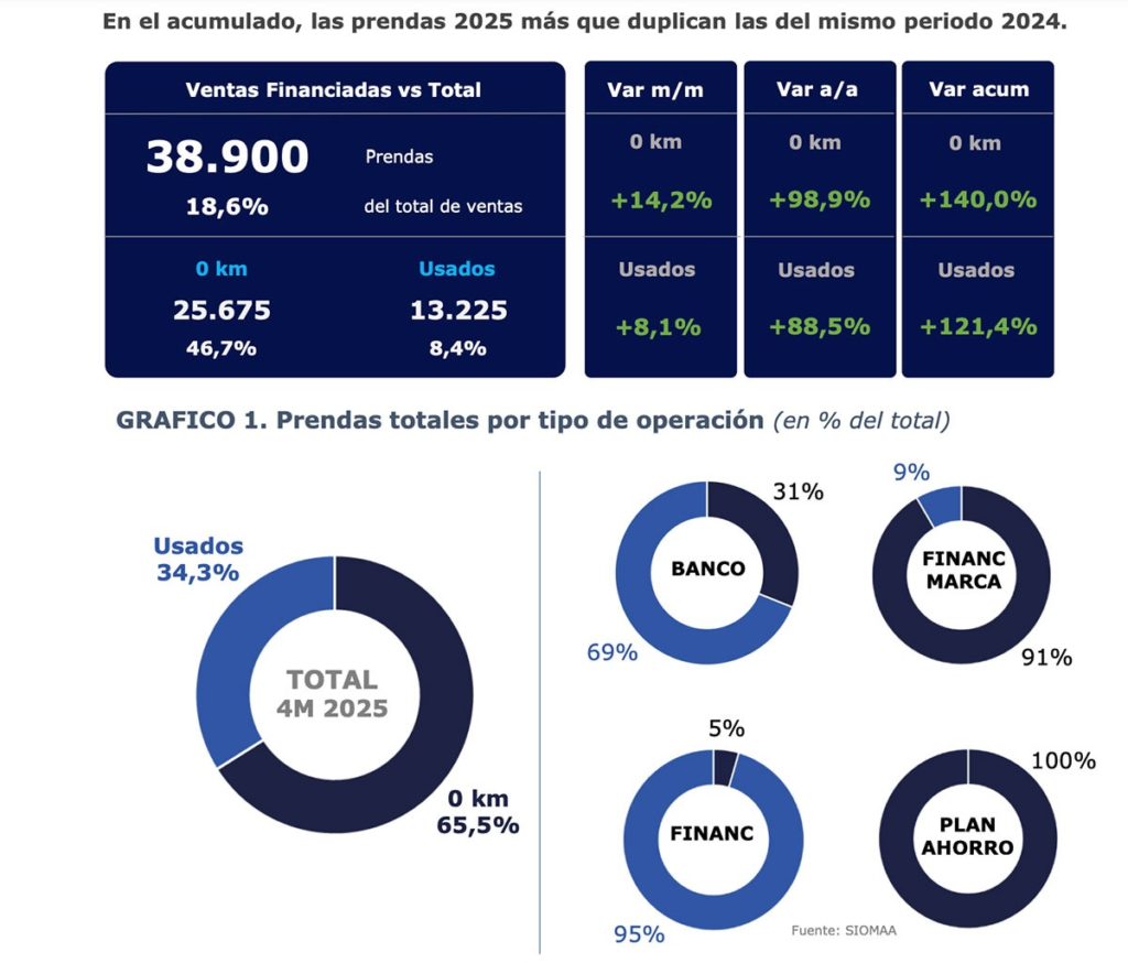 El mes de abril reflejó con claridad esta tendencia, con 38.900 prendas inscriptas en total. De este número, 25.675 correspondieron a unidades 0km y las 13.225 restantes a vehículos usados. Estas cifras representan incrementos interanuales del 99% y 89% respectivamente, evidenciando una aceleración en el acceso al crédito para ambos segmentos. El acumulado anual muestra que las operaciones prendarias más que duplican las registradas en el mismo período de 2024.