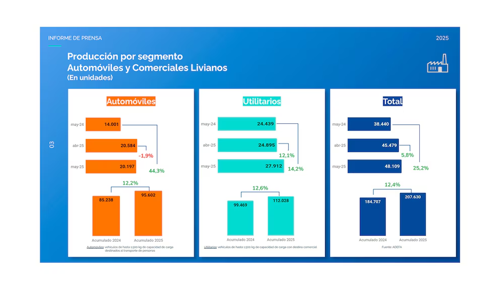 La producción de autos creció un 25% y las exportaciones un 15%. Se superaron los registros de abril, la referencia de 2024 y la del acumulado de los cinco meses