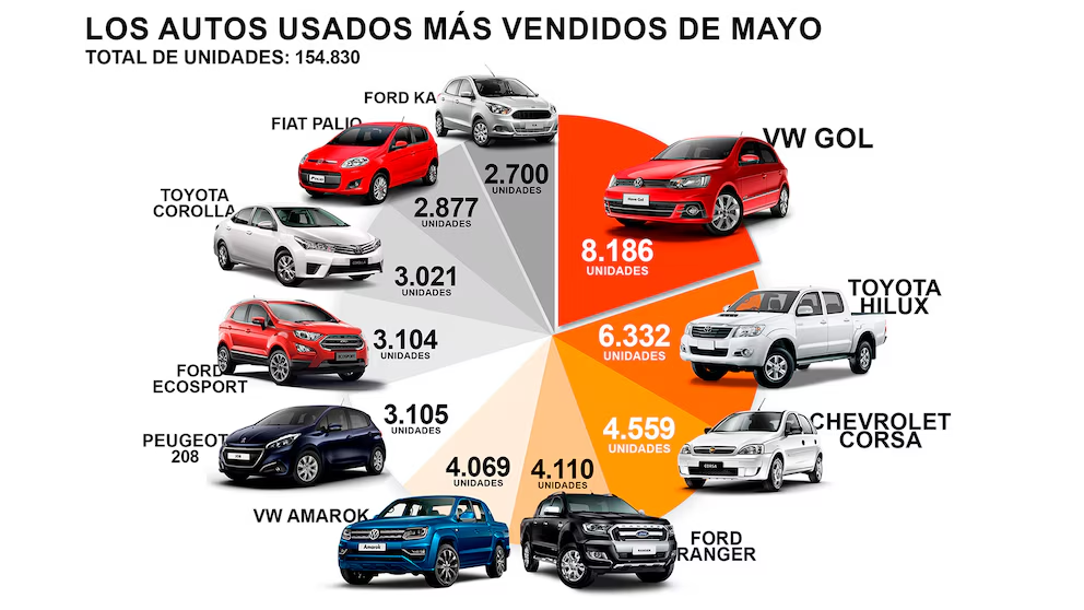 El gusto por los clásicos se complementa con el volumen de autos que tuvieron muchos años de permanencia en el mercado. Eso explica por qué el Volkswagen Gol volvió a encabezar el ranking de los autos más vendidos del mes con 8.186 unidades. Manteniendo la misma tendencia de los últimos años, el podio se completó con la Toyota Hilux (6.332 unidades) y los Chevrolet Corsa y Classic (4.559). La lista de los diez modelos más vendidos de mayo la completan Ford Ranger (4.110), VW Amarok (4.069), Peugeot 208 (3.105), Ford EcoSport (3.104), Toyota Corolla (3.021), Fiat Palio (2.877) y Ford Ka (2.700).